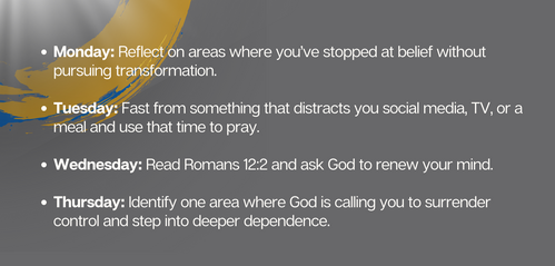 Lord, I don’t want to settle for belief alone. I want You to transform me from the inside out. Teach me to trust You in seasons of blindness, discomfort, and uncertainty. Help me to fast from distractions and allow You to reconstruct my heart and mind. In Jesus’ name, Amen.