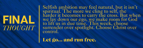 Letting go of selfish ambition means laying aside the desire to be first, praised, or in control—and instead, fixing our eyes on Jesus, who humbled Himself and served. This is the race set before us.